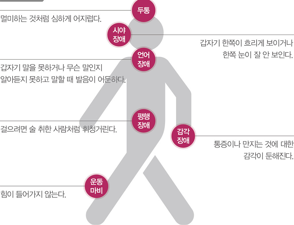 뇌졸중이 나타나면 보행장애, 언어장애, 시력장애, 안면마비, 건망증 등 다양한 증상이 나타나게 됩니다. 각 증상들은 아래와 같은 형태로 나타납니다.