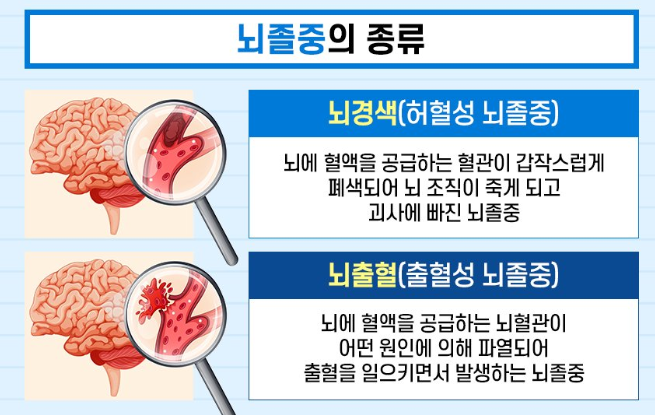 뇌졸중을 뇌졸증으로 많이들 헷갈려하시는데 정확한 병명은 뇌졸중입니다. 뇌졸중은 뇌의 일부가 손상되는 뇌경색과 뇌혈관이 터져서 발생되는 뇌출혈 2가지로 나뉩니다.
