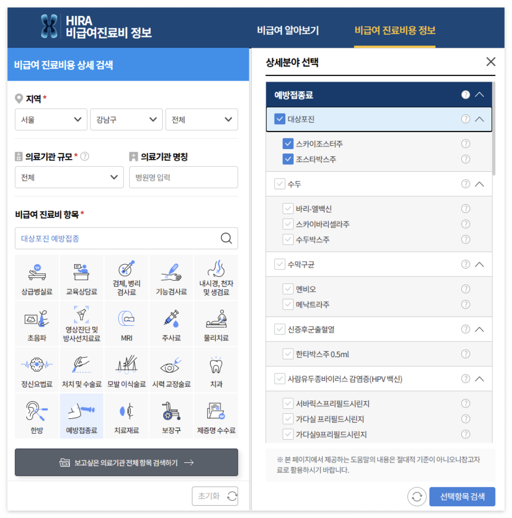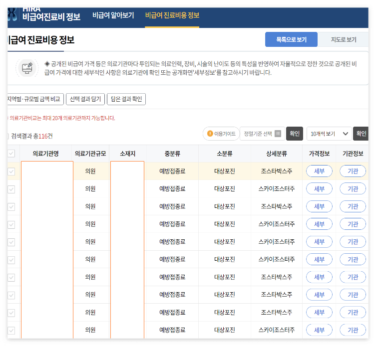 선택항목 검색을 클릭하시면 원하시는 지역에서 대상포진 접종이 가능한 병원을 확인하실 수 있습니다. 우측의 가격정보 세부를 클릭하시면 접종비용도 함께 확인이 가능합니다.